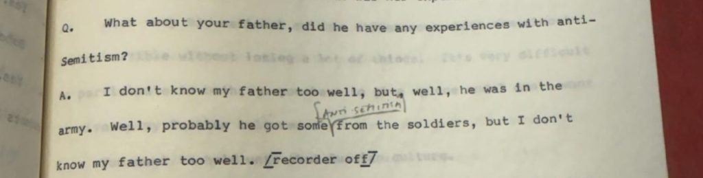 Odpoveď: Nepoznám svojho otca príliš dobre, ale, no, bol v armáde. Pravdepodobne pochytil nejaký antisemitizmus od vojakov, ale ja svojho otca príliš dobre nepoznám. [diktafón vypnutý]“