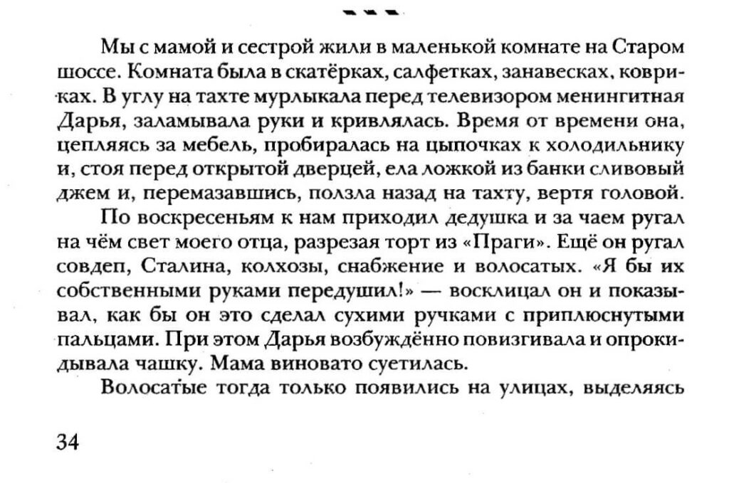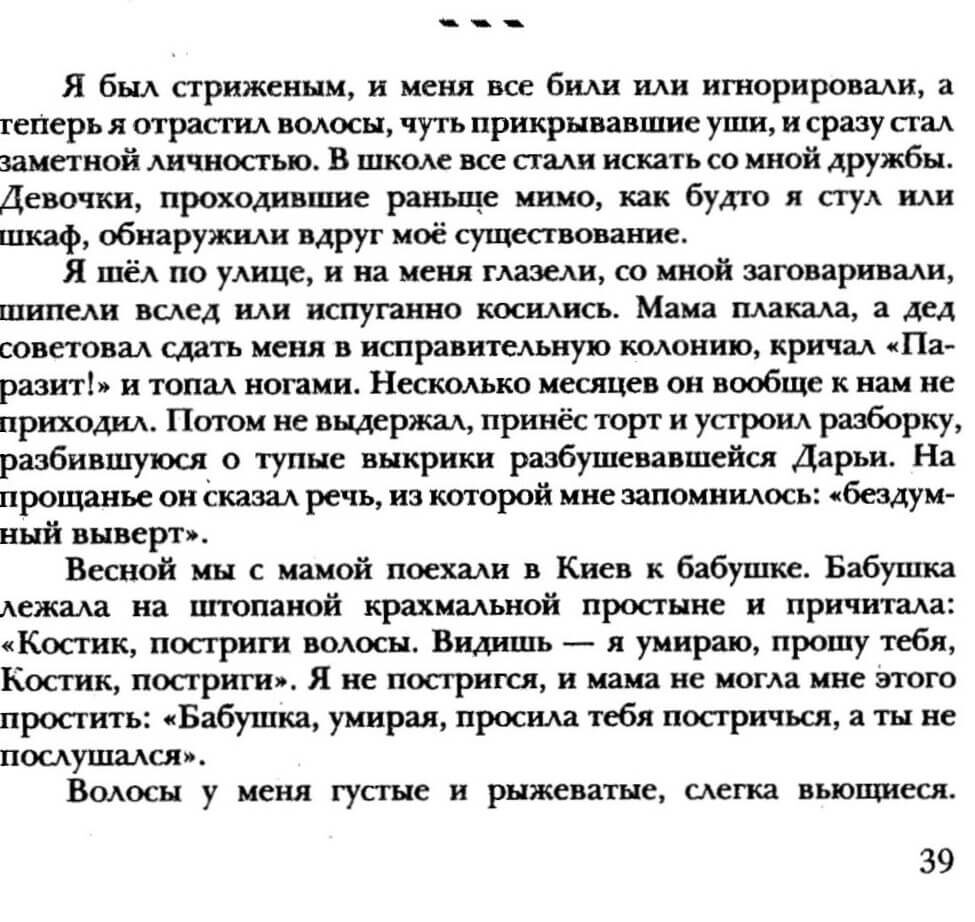 Išiel som po ulici a ľudia na mňa zízali, rozprávali sa so mnou, syčali za mnou alebo ma z boku sledovali s obavou. Mama plakala a dedko mi poradil, aby ma poslali do nápravno-pracovnej kolónie, kričal ‚Parazit!‘ a dupal nohami. Niekoľko mesiacov za nami vôbec nechodil. Potom to už nevydržal, priniesol koláč a začal hádku, ktorú prerušil tupý výkrik rozzúrenej Darje. Keď odchádzal, predniesol prejav, z ktorého som si pamätal jednu frázu: ‚bezmyšlienkovitá zvrátenosť‘.