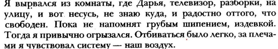 „Vybehol som z miestnosti, kde bola Darja, televízor a hádky, na ulicu a už som len utekal, nevediac kam, a bol som šťastný, že som slobodný. Až kým mi to niekto nepripomenul drsným syčaním, s výsmechom. Potom som sa ako vždy odsekol. Bolo ľahké brániť sa. Cítil som za sebou systém — náš vzduch.“