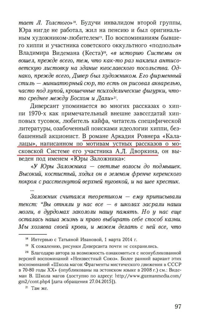 Aj samotný Dvorkin vo svojich knihách opakovane spomína hippie Sabotéra (pozri: Dvorkin A. L. Moja Amerika. Nižný Novgorod, 2013. s. 93): „Medzi pozoruhodnými samotármi bol pravdepodobne najmalebnejší Jura Sabotér. Všetko nosil čierne, čo dobre zvýrazňovalo jeho dlhé, takmer po pás, svetlé vlasy. Vo svojej izbe mal Jura všetko natreté na čierno: podlahu, steny, strop a dokonca aj plachty. Na rozdiel od nás Sabotér nebol pacifista; na stene oproti posteli zavesil podomácky vyrobený plagát s nápisom ‚Nech pracuje guľomet‘ a rád diskutoval o vojenskej histórii Tretej ríše. Zároveň sa držal prísneho vegetariánstva a dokonca kŕmil svoju čiernu mačku rastlinnou stravou, občas jej doprial mlieko…“