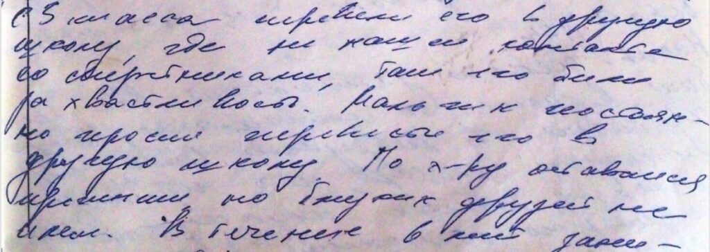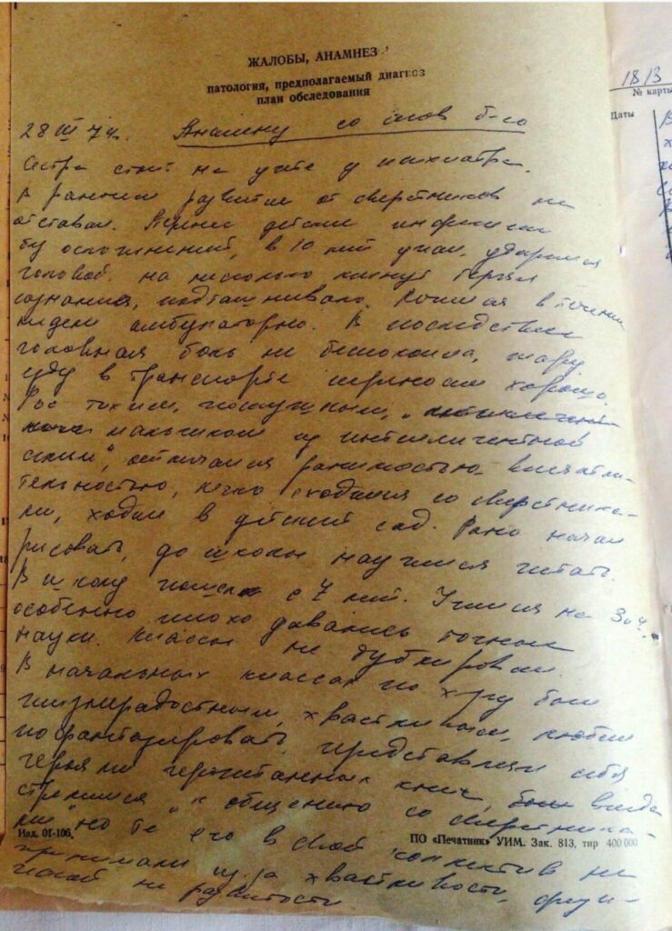 V lekárskych spisoch Alexandra Dvorkina sa uvádza: „Od 3. ročníka bol preradený do inej školy, kde nedokázal nadviazať vzťahy svojimi rovesníkmi a bol bitý za svoju chvastavosť. Chlapec neustále žiadal o preloženie do inej školy. Jeho povaha sa nezmenila, ale nemal žiadnych blízkych priateľov.“