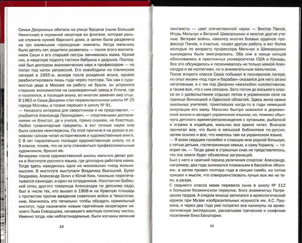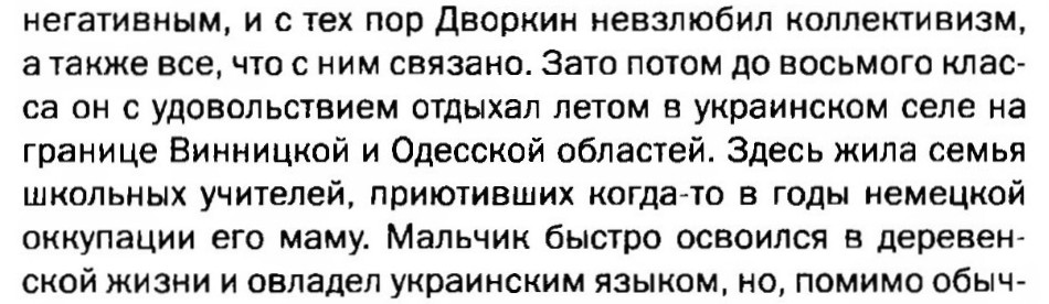 V knihe Alexandra Dvorkina „Učitelia a lekcie: Spomienky, príbehy, úvahy“ spomína, že od druhej do ôsmej triedy „rád trávil letá na ukrajinskej dedine na hranici Vinnickej a Odeskej oblasti.“ Bývala tam rodina učiteľov, ktorí kedysi počas nemeckej okupácie poskytli útočisko mojej matke.“ „Túto veľkú a pohostinnú rodinu piatich detí som si zamiloval celým srdcom. Stala sa mi ako moja vlastná, rovnako ako samotná Ukrajina… Vtedy som si ani v najhorších nočných morách nevedel predstaviť, že táto krajina bude jedného dňa vyhlásená za cudziu krajinu.“ 9