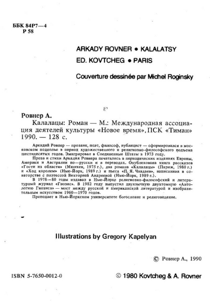 12. Book “Kalalatsy” by Arkady Rovner — Moscow: “New Time” International Association of People of Culture, PSK Timan, 1990.