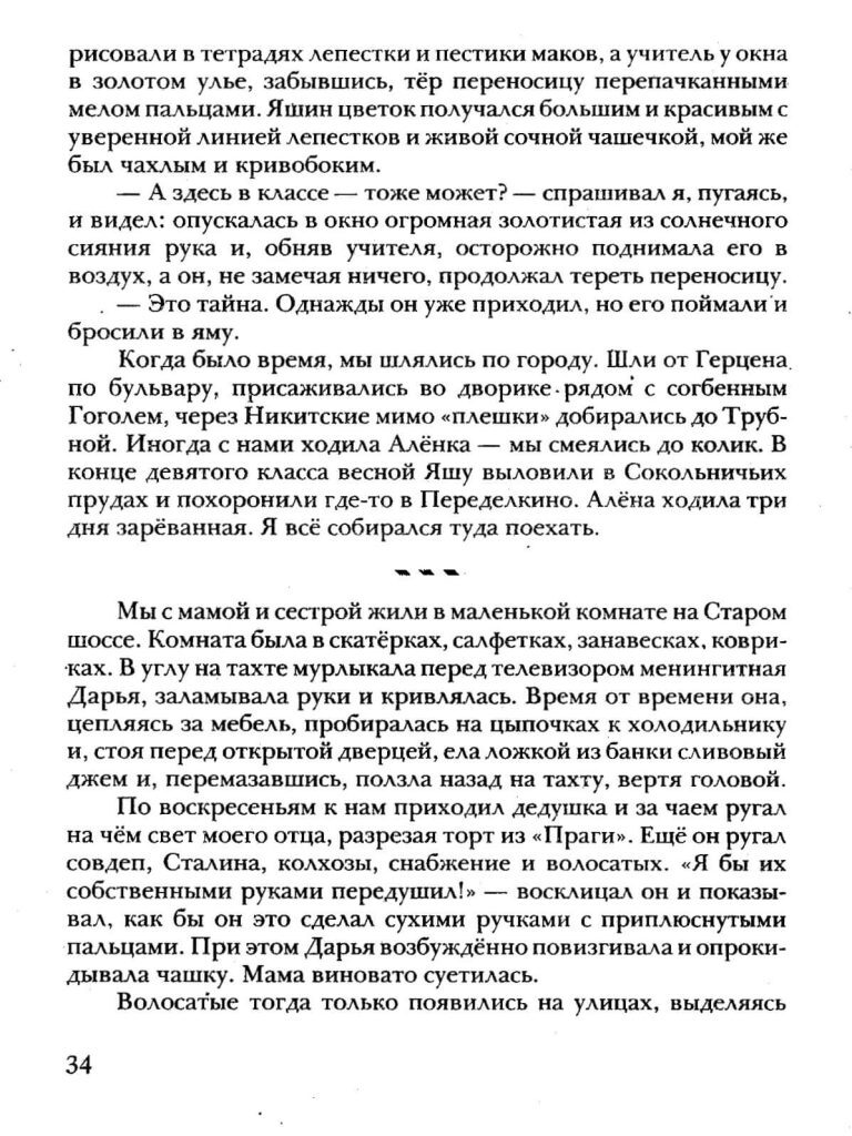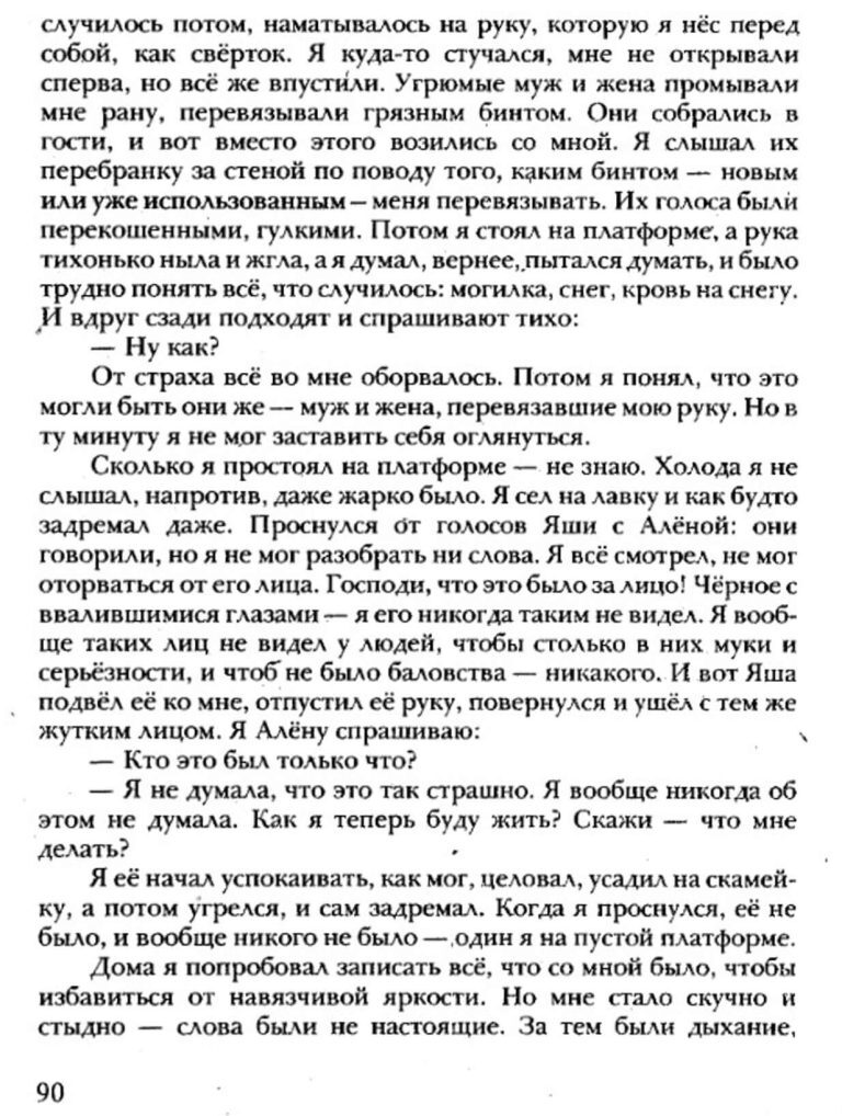„Mal som kamaráta, Jašu. Zabil sa v deviatej triede. Jeho hrob je v Peredelkine. Bol to taký plachý chlapec, koktal a stále sa ospravedlňoval. Nikdy predtým som jeho hrob nenavštívil, ale potom som sa tam ocitol. Stál som pri jeho hrobe a snažil som sa, ale nemohol som sa pevne udržať. Triasol som sa od hrôzy. A bol tam ten oslnivý sneh a všetko bolo také ostré a jasné. Cestou späť som sa potkol a zranil si ruku. Krv na snehu ma strašne vystrašila. Ale potom som sa cítil ľahký a uvoľnený, akoby ma opustilo niečo temné, husté a mučivé. Všetko, čo sa stalo potom, sa točilo okolo ruky, ktorú som niesol pred sebou, ako balík. Niekde som zaklopal, najprv neotvorili, ale nakoniec ma pustili dnu. Zachmúrený manželský pár mi umyl ranu a obviazal ju špinavým obväzom. Chystali sa ísť niekoho navštíviť a namiesto toho sa so mnou trápili. Počul som ich, ako sa za múrom hádajú o tom, aký obväz použiť —nový alebo už použitý. Ich hlasy boli skreslené a duté. Potom som stál na nástupišti a ruka ma potichu bolela a pálila a ja som premýšľal, alebo skôr sa snažil premýšľať, a bolo ťažké pochopiť všetko, čo sa stalo: hrob, sneh, krv na snehu. A zrazu niekto prišiel zozadu a potichu sa spýtal: ‚Tak ako to bolo?‘