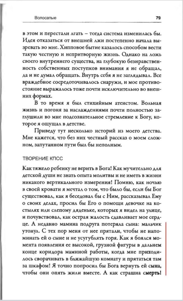 „Tu vám porozprávam niekoľko príbehov z môjho detstva… Aké ťažké je pre dieťa neveriť v Boha! Aké bolestivé je pre detskú dušu nepoznať modlitbu a nemať v živote vôbec žiadny vertikálny rozmer! Pamätám si, ako som v noci v posteli sníval o tom, aké by to bolo, keby Boh existoval, ako by som sa s Ním rozprával, rozprával Mu o svojich veciach, prosil Ho o pomoc pre dievča s barlami alebo pre slepého muža, ktorého som videl na ulici, a cítil som, ako mi srdce zviera ostrá ľútosť. A nedávno kamarátka mojej mamy stratila syna: chlapec sa utopil. Odvtedy ma od nej držali ďalej, aby jej to nepripomínalo syna a neprehlbovalo jej smútok. Ako som sa desil chvíle, keď sa jej vysoká, ťažká postava objavila na konci chodby v maminom pracovisku, keď som musel odbočiť do najbližšej miestnosti a schovať sa za skriňu! Určite by som prosil Boha, aby jej syna priviedol späť, aby mohli opäť žiť spolu. A aká desivá je smrť!