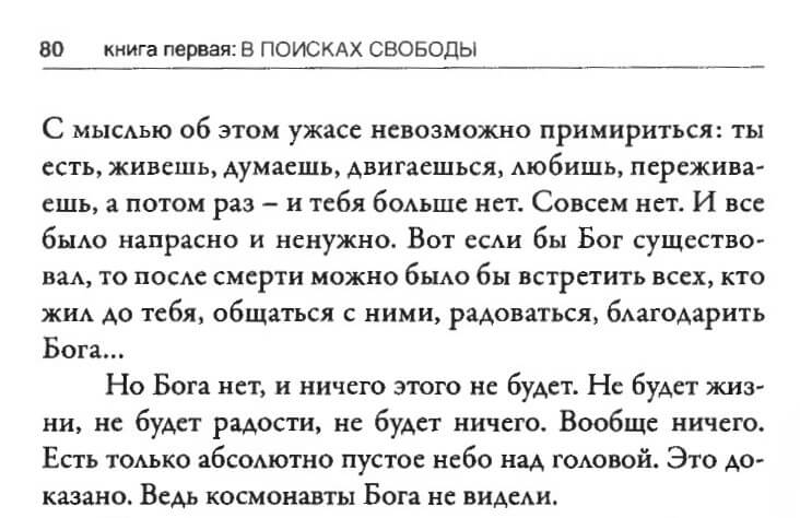 Je nemožné zmieriť sa s myšlienkou na túto hrôzu: existuješ, žiješ, myslíš, hýbeš sa, miluješ, vyjadruješ emócie a potom — zrazu — už nie si. Úplne preč. A všetko bolo márne a zbytočné. Keby len existoval Boh, potom by sa po smrti človek mohol stretnúť so všetkými, ktorí žili pred tebou, komunikovať s nimi, radovať sa, ďakovať Bohu…