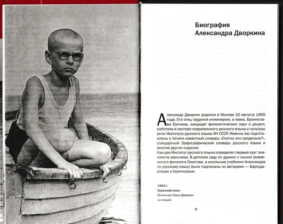 Na strane 8, bezprostredne pred začiatkom kapitoly „Životopis Alexandra Dvorkina“, je v knihe fotografia 8-ročného Sašu Dvorkina so zamračenou tvárou. Na obrázku sedí v prázdnej loďke s pozadím vodnej hladiny a oblohy. Popis znie: „1963. Kurská kosa. Školák Saša Dvorkin na prázdninách.“ 8